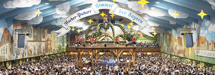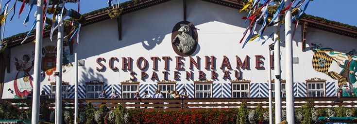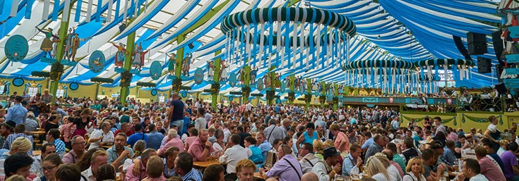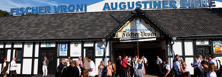 Beside a multitude of smaller tents, the Munich Oktoberfest features 14 full-sized beer tents. In addition to those run by the city’s traditional breweries, there is a wine tent (Weinzelt) and one specialising in fish (Fischer Vroni). Käfer’s Wiesn-Schänke is where the great, the good, and the glamourous go to meet. Find out more about each tent by clicking on it in the map below.